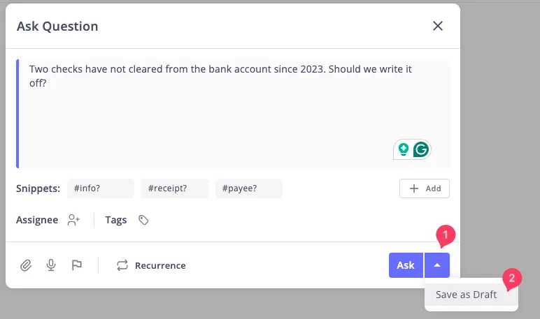 the use case sometimes, when you have a question that's not ready to be sent to clients, or you want to review questions from junior team members before sending them out, you can save them as drafts draft questions can be reviewed, edited, and then published to the client portal when they're ready how to save questions as draft while asking a client question, you'll see an option to save it as a draft in the dropdown how to review and publish draft questions in the questions module, go to the draft tab, where you will see all the questions saved as drafts you can click on three dots to edit or delete a question and publish it as required enable draft question setting to save questions as draft, firm admin must enable the below setting first